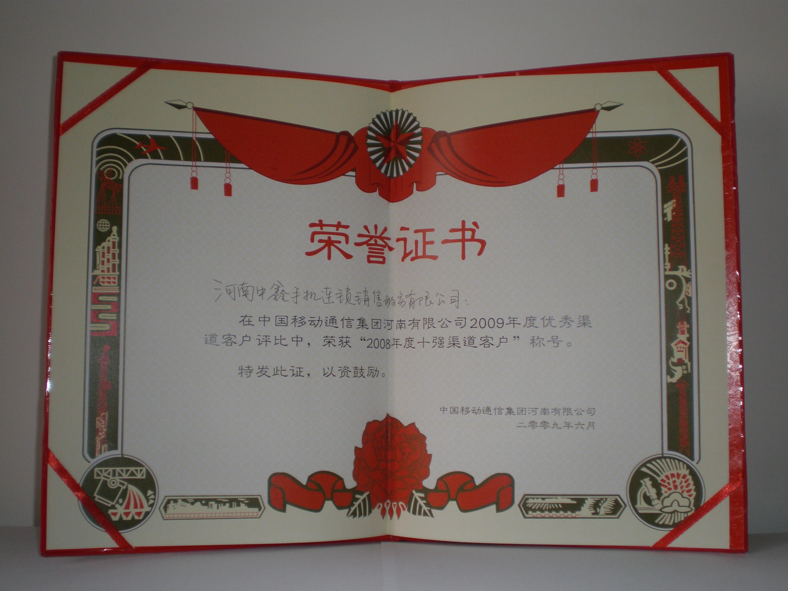 中鑫手机连锁荣获省移动“2008年度十强渠道客户”奖