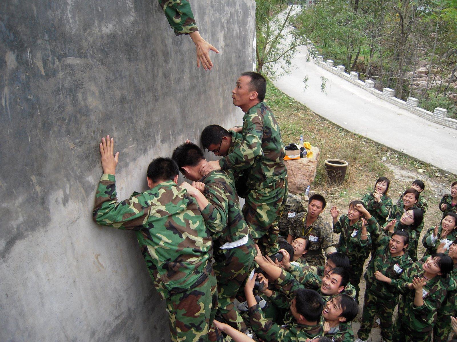 军旅拓展的高潮部分出现在“逃生墙”这一章节。“用最短的时间,不借助任何工具,攀越4.2米的高墙。”
