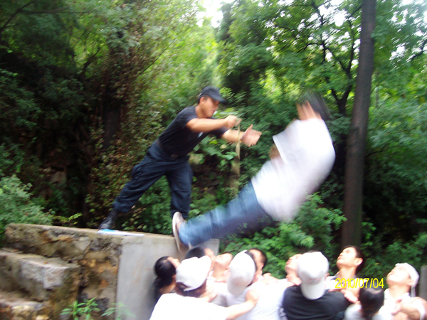 刚开始,不知道是见了同事的激动,还是体验到清新自然的亢奋,亦或是这个团队本身的散漫,大家的报数、军姿、气势都是那么的凌乱、无序和消沉。经过教官的严格要求和队伍自身的调整,同事们渐渐进入状态。整齐划一、气势如虹成了我们队伍的真实写照。随着一个个项目的开展,团队的变化也越来越大,“众志成城”、“激情节拍”、“电网穿越”、“信任背摔”、“海底逃生”,每一个项目完成的都是那么的干脆利落。当看到大家穿着雨衣军训,感冒的不掉队,身体稍胖的更是付出比别人更多的努力,“人墙”队员肩上被踩的渗了血丝、汗水顺着脸颊往下滑落的时候,包括领队在内,大家心里充满了感动、欣慰和自豪。