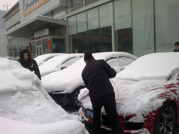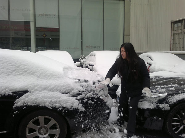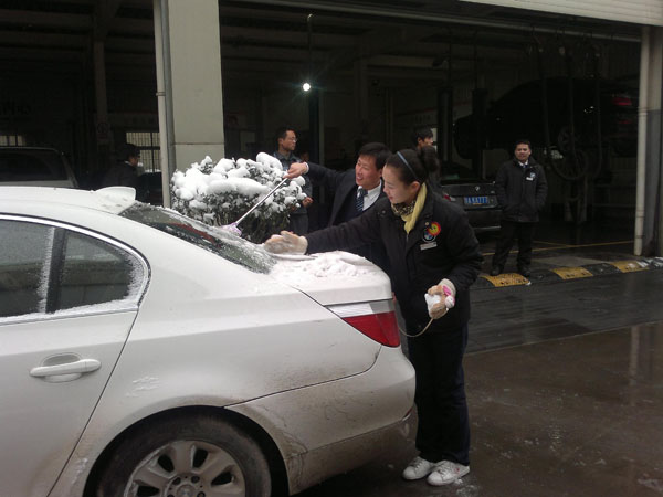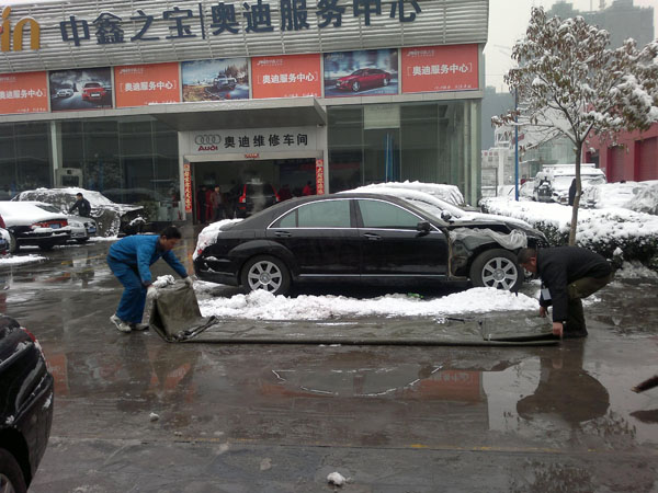 这个办法也不错,很快就清理了车衣上的积雪。赞一个!