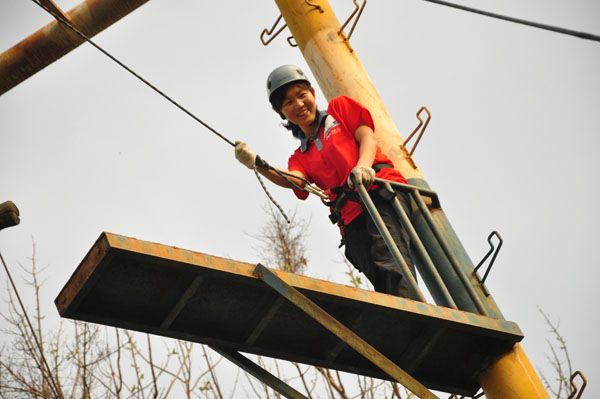 在教练教大家完成基本的训练后,破冰训练开始了,首先从经典的拓展训练之一——“高空断桥”开始,顾名思义,这个项目就是在距离地面8米的高空搭起了一座独木桥,而这个桥的中间却是断开的,间距1.2米-1.4米,要求所有队员爬上8米的高空后,从一侧迈到另一侧, 爬上去之后看着狭窄的断桥,甚是艰难,这回可是知道“步履维艰”的含义了,但是新世纪的精英,岂能被眼前困难吓倒。大家互相打气鼓励,连最胆小的女同事都鼓足勇气跳跃了障碍,“高空断桥”不仅让队员们学会了如何突破自己心理的极限,增强员工面对挑战时应具备的生存能力和适应能力,更可以说是一次非常难得的经历。
