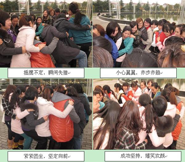 “团团坐”几乎是各个拓展培训中必修的项目。活动要求前一个人坐在后一个人的腿上,不能抬腿不能抬屁股,所有参与成员都必须坐稳坐实,并围成一个圈。该项目是为了提示大家团结协作与信任是团队协作的根本。活动必须靠团队里每一个成员相互信任,团结互助才能够圆满完成。