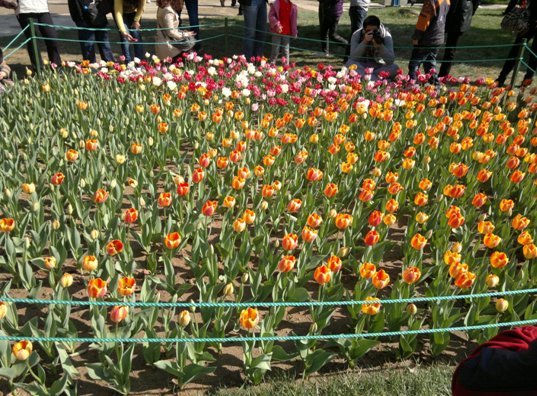 我们来到郁金香园区,盛开的郁金香朵朵屹立,黄色的,显得那么雍容、华贵。白的,是那么洁白庄重。红的,让人觉得热烈奔放。紫的,而少有的黑色,让人肃然起敬。五颜六色的花朵,展示出生命的活力。它们在青翠的绿叶映衬下,显得那么娇艳鲜美。有的才展开两三片瓣,有的花瓣全展开了,片片的花瓣顶着嫩嫩的尖尖,调皮的探出头,有的还是花骨朵,看起来饱胀的马上要破裂似的,好似要迫不及待地看看这大千世界。一些花瓣上还留着水珠,让人觉得那么生动、美丽。一阵微风吹来,朵朵郁金香像一只只花蝴蝶,拍打这翅膀,翩翩起舞,叫人目不暇接,神迷意醉。