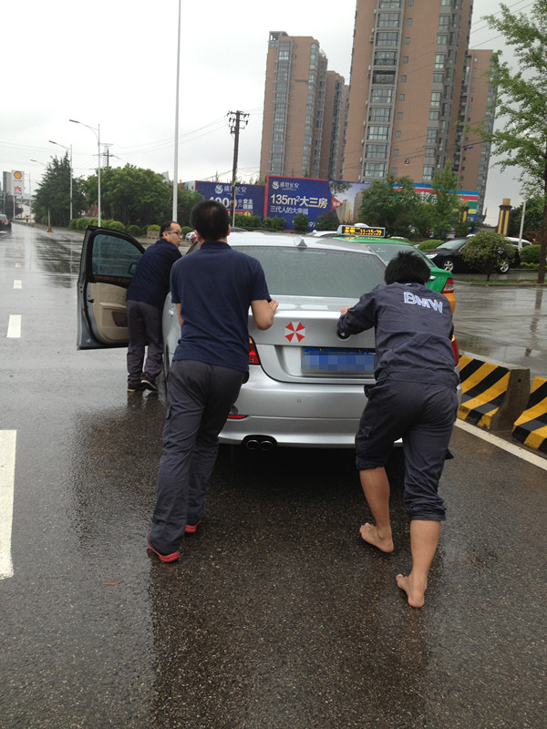 近日,暴雨弥漫西安,早10:00左右维护部经理辛欣接到陕牌宝马5系老客户求助电话,车行驶在郭度五龙车城附近的水洼处熄火,熄火后并重新发动了汽车,指示车辆进水,情况紧急;辛欣在电话中先安抚客户紧张情绪,并第一时间联系宝马车间余主任,郭光辉质检带领维修技师行乐、柳洋和辛欣一同驾驶救援车赶往救助现场。