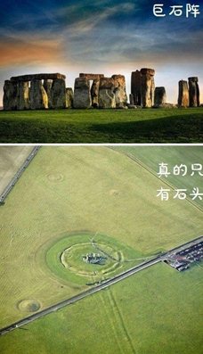 图片中是我们熟知的建筑:埃及金字塔、印度泰姬陵、巴塞罗那的圣家堂、英国巨石阵以及美国总统山。这些建筑,有的庄严,有的神秘,几乎是一个国家的代表,提起他们,我们如雷贯耳。这组图片中,摄影师先是为这些建筑单独拍了照片,随后把镜头拉到最远,把这些建筑置于整个大环境下,再与原来的图片做对比,这时候,有意思的现象出现了:上图是独立在荒漠里的金字塔,黄色的沙漠,黄色的塔身,孤独而庄严;而下图,镜头拉远,荒漠和楼群、城市交接,那种孤独的庄严一下子充满人烟;第二张是泰姬陵,坐落在青山碧水之间,美轮美奂,让人心驰神往,再看下图,镜头拉远之后,泰姬陵的门前却是污水横流,垃圾遍布的荒野;第三张是圣家堂,看细节之处,绿树成荫,绿水环绕,幽静别致,自是一片人间桃源,而下图,镜头拉远,圣家堂一下子淹没在高楼密布的繁华闹市里;最有意思的是英国的巨石阵和美国的总统山,单看巨石阵,真的以为是石头林立呢,再看下图大环境,忍俊不禁:整个巨石阵只是广阔无垠平原正中的一堆石头;就连总统山,也不过是怪石林立的山群上的一点石雕……