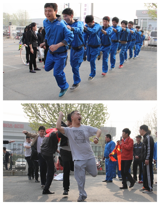 春季运动会中,我们财务部与配件部、精品美容部、行政部一起统称为综合部,由配件部王玉双王总领导。由于部门多,人员间不熟悉,我们队没有任何优势。在第一场比赛中我们排名第三,这出人意料的成绩让我们很开心,但在最后一项“链接加速”中,因一人跌倒我们一群都跌倒了。这时有人喊着说要我们放弃,但我们站了起来,重新回到起点,调整队形与节奏后就开始了,我成为领跳的人,我知道无论怎样自己都要坚持,我的快慢决定了大家的步伐,最终大家终于全都成功到了终点!