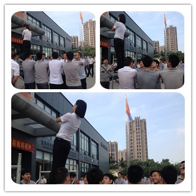 九月份开始,每周四都是营销中心和运营中心一起游戏一起活动的好日子, 而2014年9月18日的活动彻底让我们突破了心理防线。在活动中,主持人将拓展训练中的“信任游戏”直接搬到了现场,在一人高的架子上,每个队分别派出十名队员站在背摔台上,背对着大家,小组其他成员在其身后用双手做保护,接住往下倒的队员。