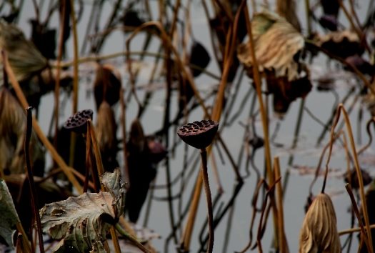 已至深秋,荷已完全失了水分,焦黄的叶,残枯的茎,如同经历过沧桑的老人,独立在清冷的水中,孤独而苍老。