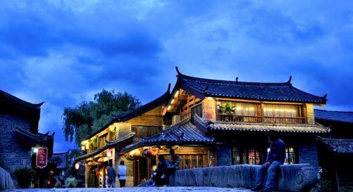 机场、高速、城市的霓虹,浮光绿影般从眼前划过,车一停稳,我迫不及待的打量着,脚下是石板路,两侧是低矮的房,触目所及是葱郁的树影,耳边似有似无的水流声,安静,仿佛来到了乡村,似乎又有些不同。拖着行李,轱辘颠簸的声音好像都有回声,一直伴随我到达客栈。安顿下来,我拾阶而上,在屋顶的平台上极目远眺,重重的山影模糊迷蒙,独有一处,灯火通明,在这夜晚显得别样的色彩斑斓,仔细倾听,还有劲爆的舞曲声,我猜想那应该就是有名的酒吧一条街。这就是,束河古镇的第一印象。