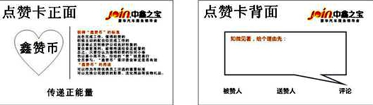 人人都能赞,人人都有责,无论你是前台的接待,还是精品的专员,只要你积极奋斗,只要你让客户从心感受到我们的优质服务,鑫赞币你值得拥有。或许你只是接车报价的SA,或者你只是机油保养的汽修工,但是你的努力可以不只是一个简单的报价,也可以不只是简单的机油更换,你可以在客户到店的时候与客户经理联系,让客户有人接待而不觉得无聊或者空虚,你也可以在车辆保养完后,亲自给客户建议车辆小知识,让客户对自己的车辆更深入了解,多走一小步,成功一大步,你的细心不只是为了让你的工作更出色完成,也会让客户认识到我们公司整体更出色的部分!