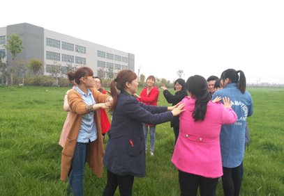 我们接着玩的第二个是背靠背的游戏,这个游戏要求队员背靠背坐在地上,胳膊挽着胳膊,背部共同用力站起来。刚开始,两人一组,大家基本都能轻松的完成。最后人数不断增加,难度也增大了。这个游戏需要相互配合,齐心协力才能完成。我们全体队员20个人,经过不断地尝试,调整队形,最后大家一起努力把这个动作完成了三次,连教练都为我们自豪。