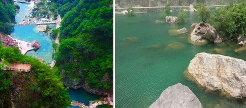 这里有散客、团体游客都积极的配合着游览秩序,我们买过团体票需要在经过一段山路,车里一眼望去这里碧水丹山,明丽如画,犹如人间仙境,不愧号称“中原第一瀑布”。到达停车场,十点的停车场已游客云集,我们开始结伴漫步在这宝泉小西沟中,缓缓流水中夹杂着一个个清澈见底的幽谭,有的浅绿、有的深蓝,里面的小鱼清晰可见,哇!用手捧起泉水洗把脸,瞬间感到多么的清凉舒爽,我们沿着石板小路,晃晃悠悠,不紧不慢呼吸这山里的清新空气,中途大家觉得背着大堆的吃的太沉停下脚步歇歇脚,看着青山绿水自有一份轻松放松感,经过了几个小时的山路终于到达了半山腰的玻璃站台处,站在最高处往下俯视,疲惫的身躯被这迷人的风景早已吸引了,一点都不觉得累,山那样的高、水那样的绿、瀑布那样的直,一眼望不到山的尽头,大声呐喊的回荡声,给人藏在心底的压力得到释放,心旷神怡,真正体会到了这里的山水之最。