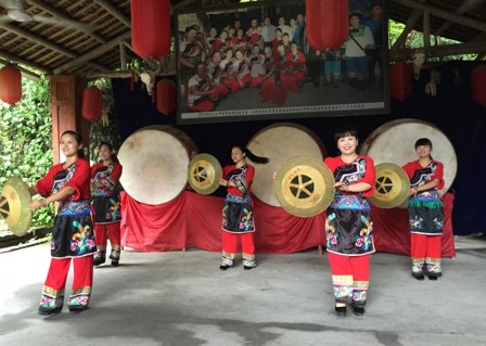 接着导游又领着我们来到开阔的场地,三面迎宾苗鼓一字排开,五个苗家姑娘灵雀般跳跃,动作飘洒,整齐划一,鼓声雄浑。鼓罢,热情的苗家姑娘邀请我们,也来打打鼓。姑娘们先示范一遍,再分解每一个动作。有些游客也抡棒敲了一遍,笑声不断。苗家姑娘们还把用手工缝制的有着鸳鸯图案的鞋垫馈赠给我们,我们也回送了钱。最后,欢乐的鼓,又被敲起来,热情的苗家姑娘们,拉着我们的手,围圈跳起了欢快喜庆的鼓舞。在欢快的舞中我们更深的体会到他们的热情好客,在欢快的表演中,我们结束了这次夯吾苗寨之旅。