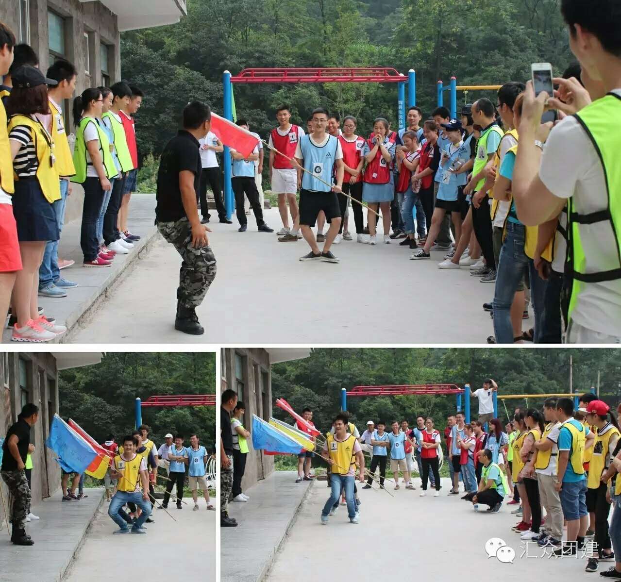 先来比试六队中哪一对喊得不齐,最差的要受处罚。处罚也很简单,光脚站“搓衣板”,边跳边喊:“哟呵,哟呵……”