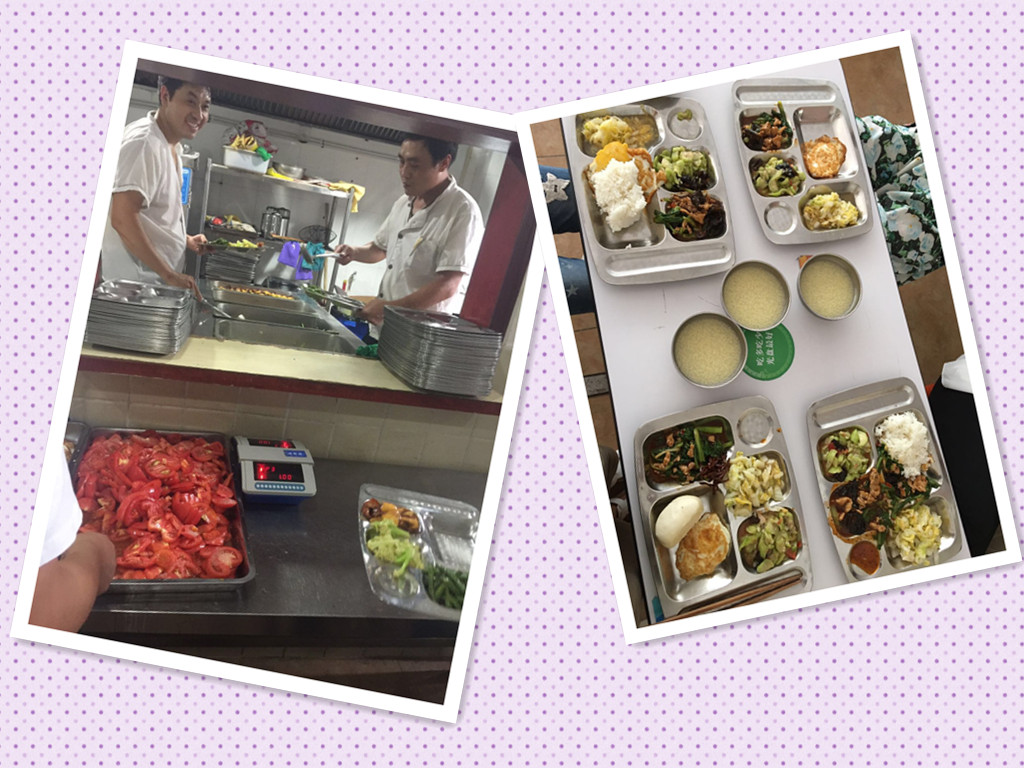 周一(干煸鸡块,炝包菜,炒有机花菜,大米,馍,黄瓜段,小米汤)