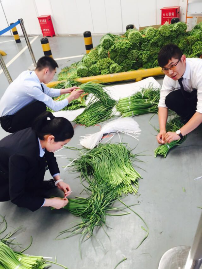 蒜薹到店后,工作人员开始分堆成捆,便于客户携带。看大家工作得多认真,虽然没有秤,但凭感觉也能分得很好。