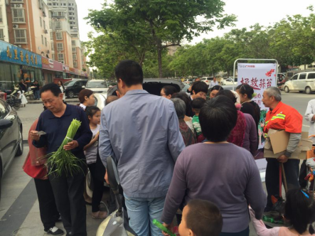 一大车蒜薹在店里是发不完的,毕竟客户有限,下午快下班的时候,店里的工作人员带着蒜薹来到附近的小区,福利广大邻居,整整半车的蒜薹,不一会功夫就发完了,朋友们很是热情,把我们的展位围得水泄不通,谢谢你们的支持。