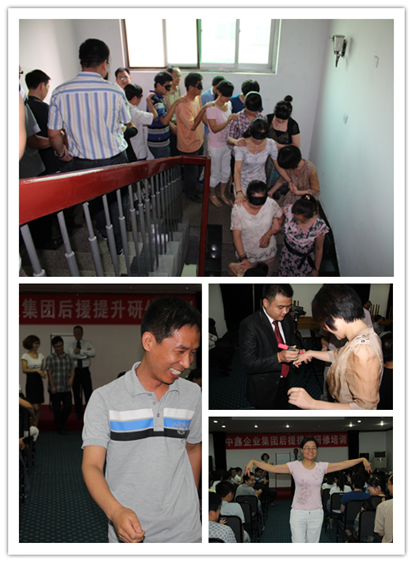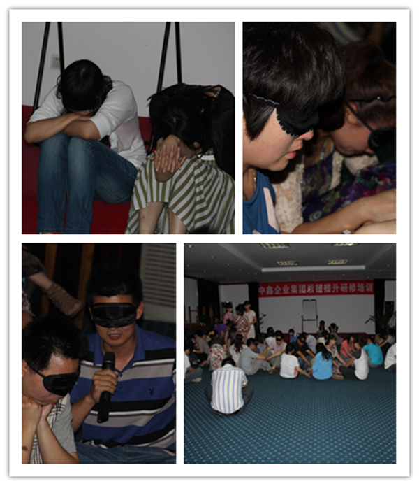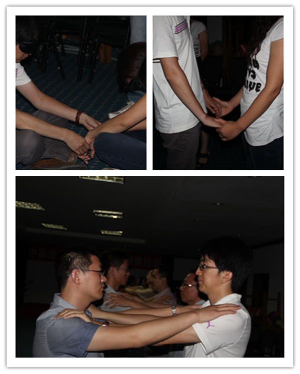 据很多同事反映,坎坷人生路是本次培训最精彩的部分。游戏先是通过扮演盲人和哑巴进而到大家都戴上眼罩,在漆黑的屋子里,切断所有的光源,狂风暴雨的音乐起,讲师以动情的声音解读了一篇关于亲情的故事。当音乐停下的时候,大家久久不愿起来:大多数伙伴坐在地上,如同雕像一般,感动的哭泣从他们身上蔓延开来。在分享中,很多伙伴想到了自己的父亲和朋友,也有伙伴表示要珍惜身边的每一个人……
