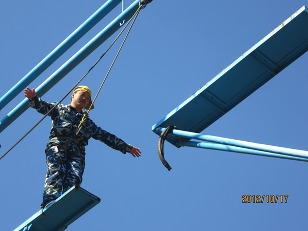 团队组建完毕后,拓展项目依次展开。第一天下午进行了“信任背摔”和“共建家园”两个项目。在“信任背摔”项目中对于害怕恐惧的队友,全体队友一起给予鼓励加油,以“不放弃,不抛弃”团队精神为支柱,所有队友全部顺利完成。