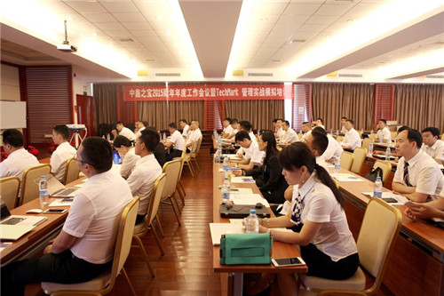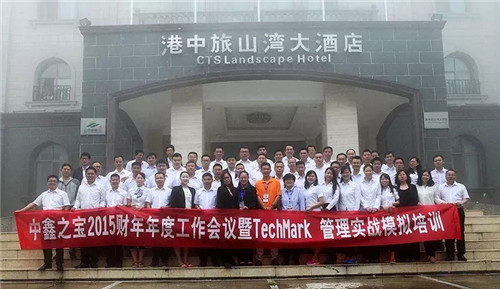 2015 年 5 月 24 ——5 月 29 日,中鑫之宝2015 财年年度工作会议暨TechMark 管理实战模拟培训在信阳市鸡公山景区山湾大酒店隆重召开。中鑫之宝总部管理人员、全国24家分店总经理、店面核心管理人员及北京鑫明德机电设备公司、中鑫之宝保险代理公司相关负责人共60余人参加了此次会议。中鑫集团总裁季卫东、中鑫之宝总经理田玉峰出席此次会议并发表讲话。此次年中会议的主题为“拥抱变革聚焦服务苦练内功决胜江湖”。与以往的年中会议不同,参会人员首先穿越到了Techmark世界,在一个虚拟的商业帝国中排兵布阵、运筹帷幄。为期2天半的实战管理培训后,大家“重出江湖”,用全新的视角来审视自身与当下的工作。Techmark课程带来思维碰撞。