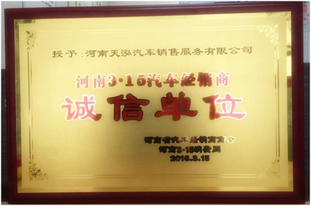 2016年3月15日,由河南省汽车经销商商会、河南3.15消费网联合举办的诚信单位授牌仪式在昭润商务酒店隆重举行。