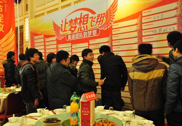 下午14点整,参加晚会的同事依次进场,分别在现场两侧的许愿墙上签下自己的愿望。15点整,中鑫汽车2012年总结表彰大会在“让生命绽放,让梦想飞翔”的主题下拉开帷幕。一段开场视频让全场为之沸腾。画面中,中鑫之宝现有的店面一一呈现在大家面前,未来的发展蓝图也一览无遗。