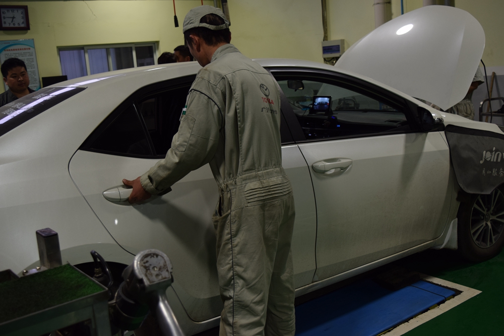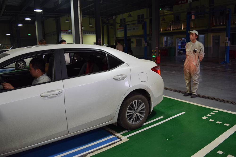 第一项:车辆灯光的检查,在技师的口令下,车内人员进行有关车灯的检查,主要包括:左转向、右转向、刹车灯、倒车灯、小灯、牌照灯、后雾灯、危险警告灯;