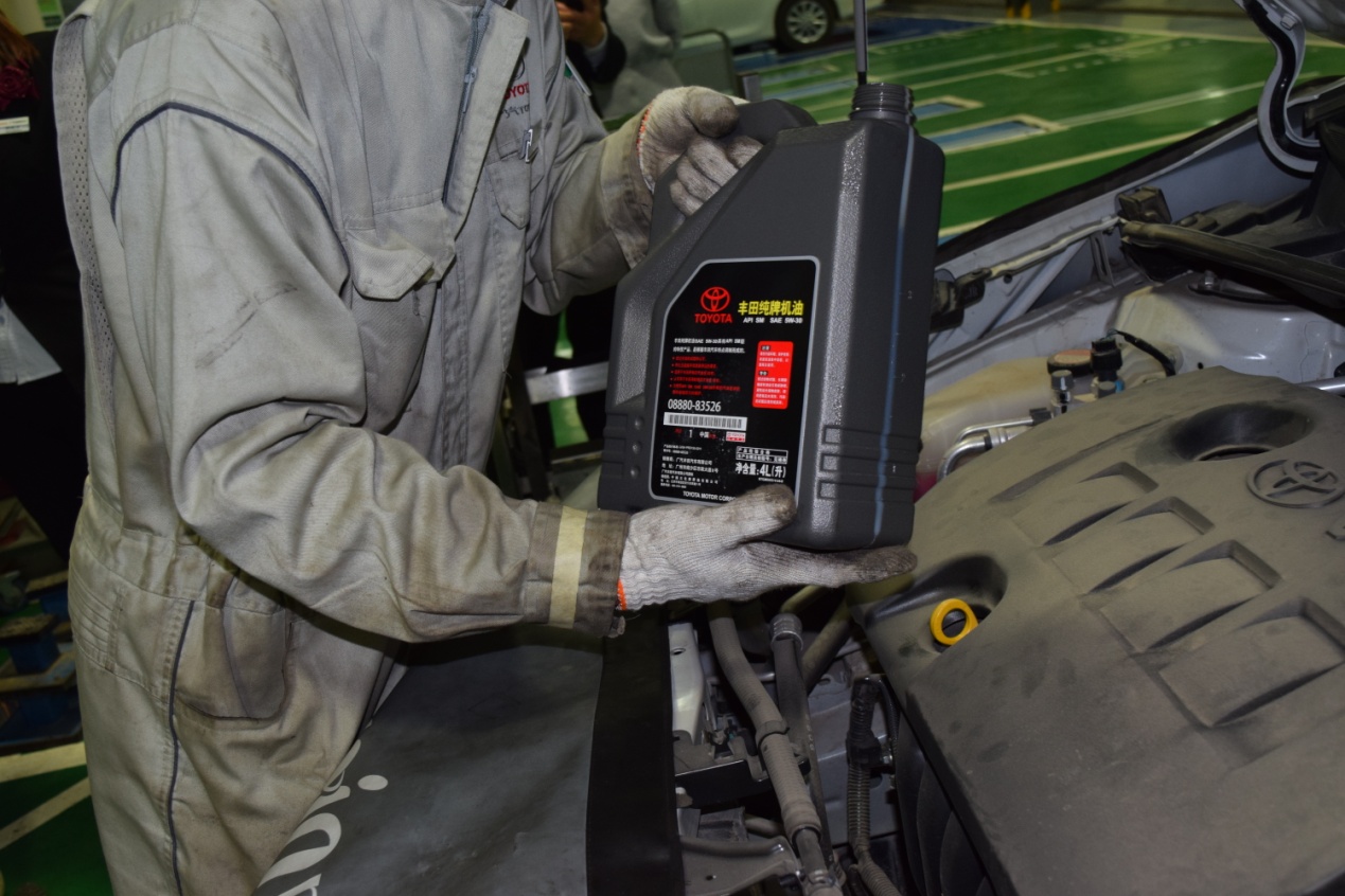 第八项:更换机油。这个是保养必做的吧,把废机油倒出来,鑫宝店保养加的都是丰田小桶纯牌机油,大家可以放心使用;