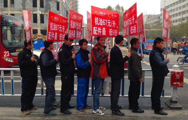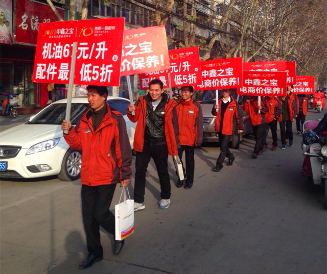 这是建店初期试营业期间王萌带领团队扫街,举牌游街宣传的照片