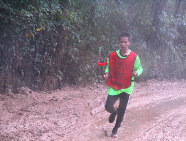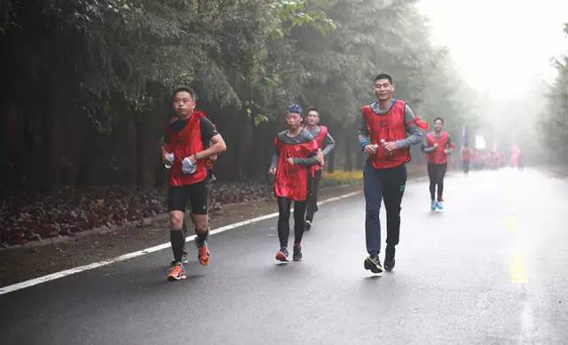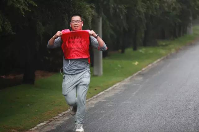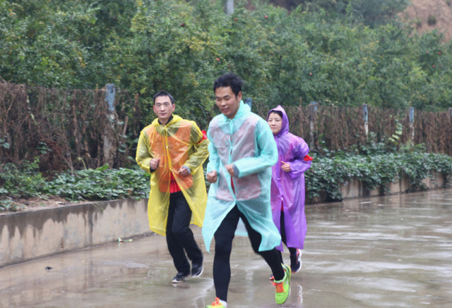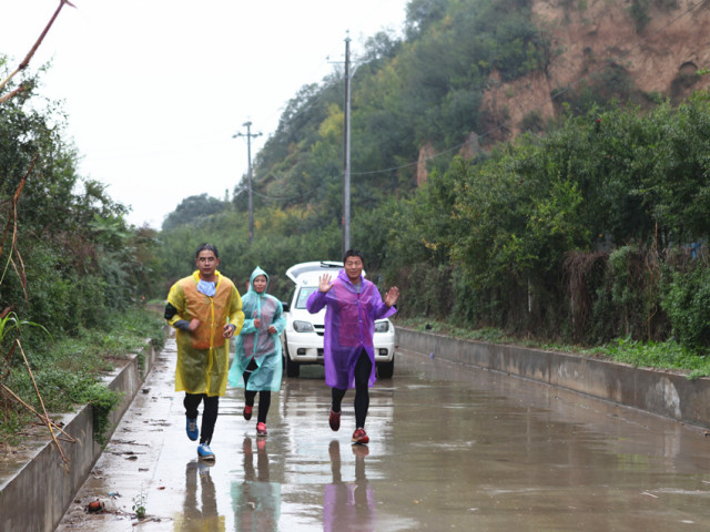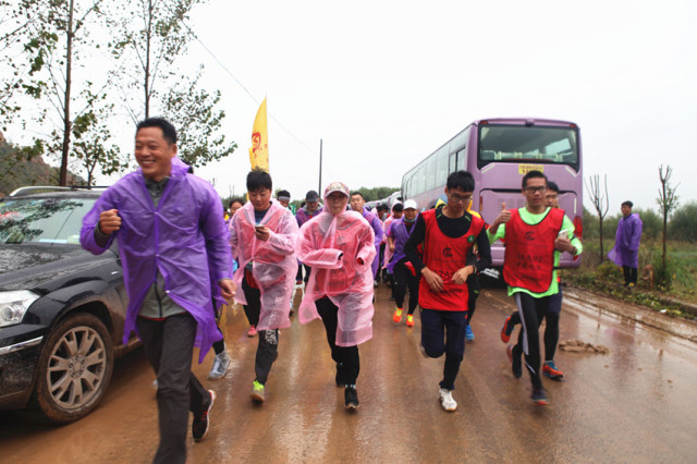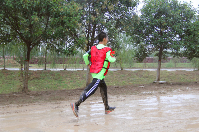 很多队员为了跑步方便脱下雨衣,冒雨前进!