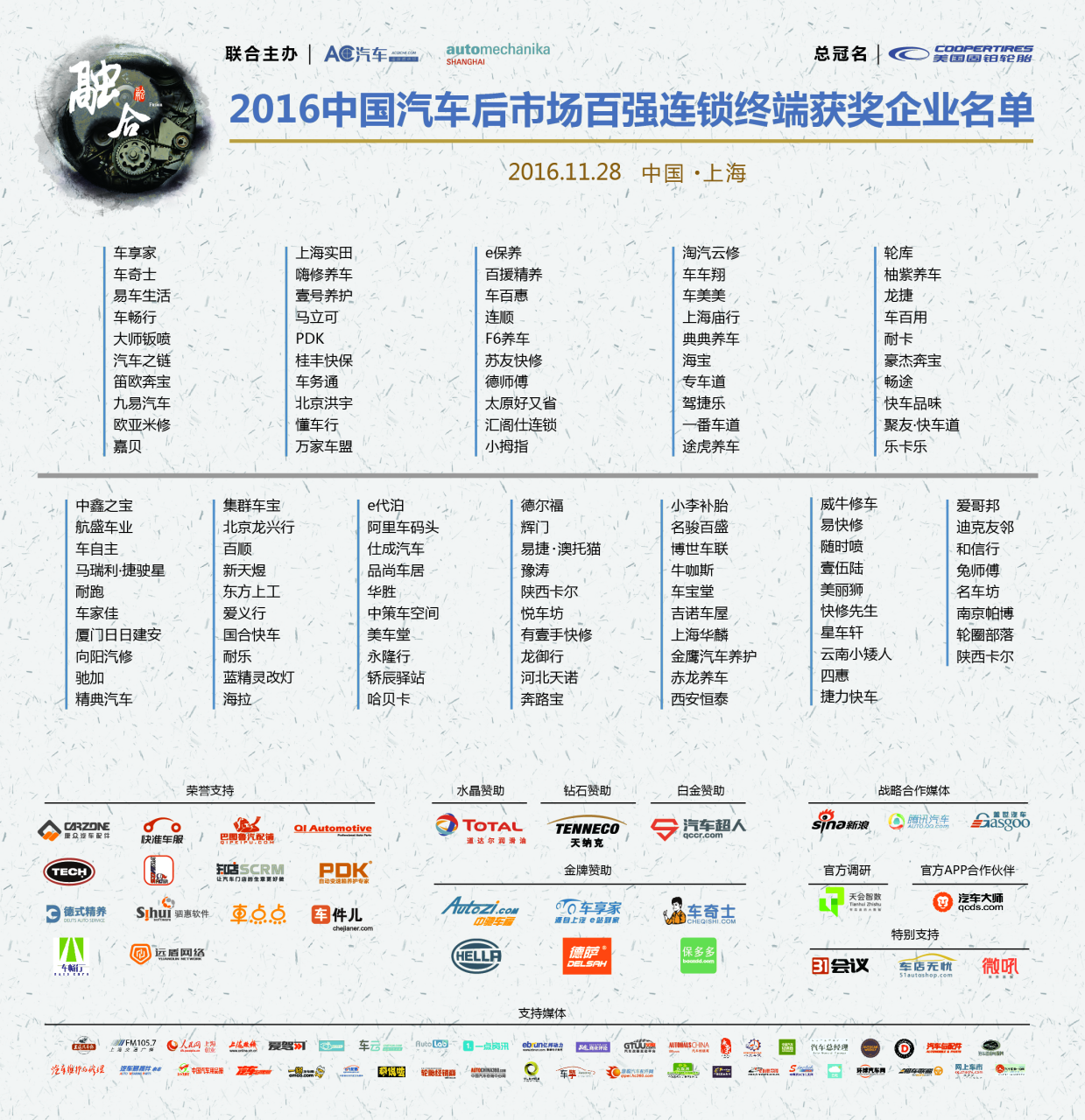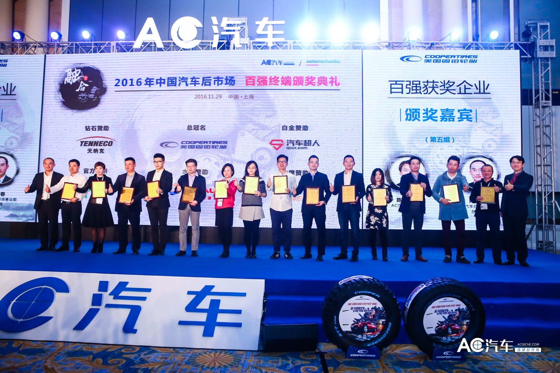 11月28日,由AC汽车(acqiche)与法兰克福展览(上海)Automechanika Shanghai联合举办的“美国固铂轮胎•2016中国汽车后市场百强连锁终端颁奖典礼”在上海盛大举行。
