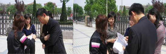 付新奇经理和动感地带品牌经理张琨、主管王颖与教官一起商议训练中需要注意事宜