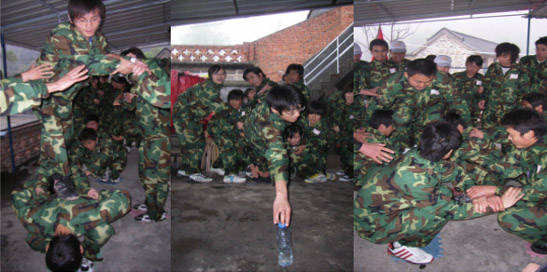 在“方阵寻宝”项目的训练中,学员要在规定的时间里站到教官放好的坐垫上。这是个需要集体参与,集体出谋划策的训练项目。让学员开动脑筋,互相配合,勇于奉献,是这个项目的目的。