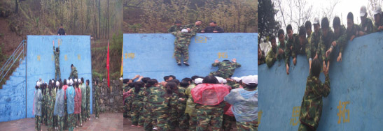 风雨过去了,阳光把温暖挥洒。已经在拓展中长大成熟的孩子们,举着飘扬的队旗排着整齐的队伍,来到了训练场地。这里是他们最后的培训项目---攀登毕业墙。这是一个高达数米的墙体。想凭借一个人的力量,根本无法徒手攀登上去。要在规定的时间里,攀登如此的高度,实属不易。