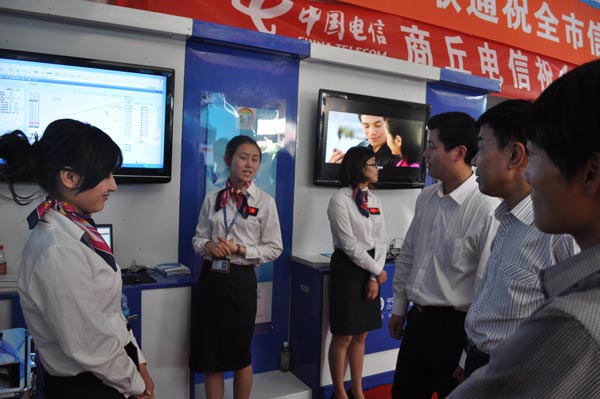 商丘市市长出席本次会议,并做重要讲话。来自中国移动,中国联通,中国电信的三大运营商为了配合会议的召开,在一楼大厅内展示了信息化相关的业务。商丘移动本次展示了6个展位,分别是科技感较强的一卡通业务,位讯通业务,道路监控,双向视频,手机支付业务,还有商丘市移动公司特有的行政效能电子检查业务。展示区内还配备G3产品展示区,一些G3手机的展示吸引与会领导驻足,并有数十位领导入展示区进行业务体验。