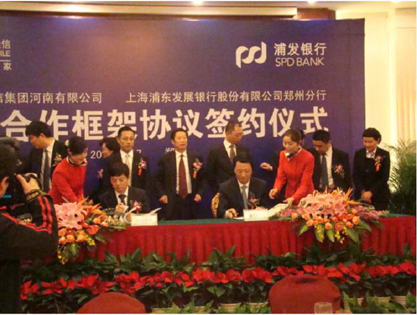 2011年3月17日上午在中州皇冠假日酒店举行了由中国移动通信集团河南有限公司与上海浦东发展银行股份有限公司郑州分行战略合作的签约仪式。郑州市移动公司总经理贾大春及浦发银行郑州分行赵春平出席本次签约仪式并现场签约,来自省移动及浦发银行的相关领导及负责人60余人也出席本次签约仪式。
