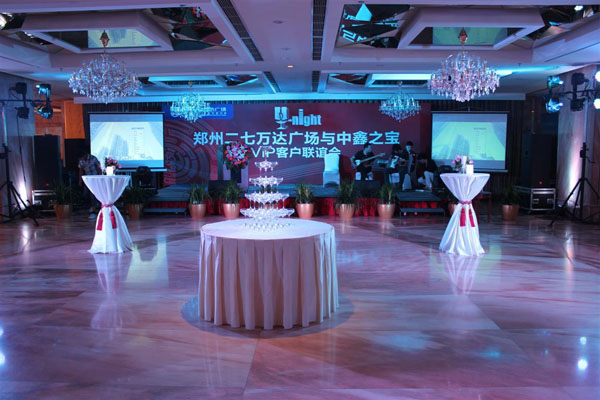 2011年7月9日由中鑫天地传媒承办的郑州二七万达广场与中鑫之宝VIP客户联谊会在郑州裕达国贸酒店7楼文奇厅如期举行,整个联谊PARTY涵盖;花样调酒、精彩演艺、游戏互动、抽奖、模特走秀等几个环节组成,晚上21点联谊会在柔美的灯光,唯美的现场布置,美酒、美女的衬托和彰显高贵、典雅充满欢快的气氛中圆满结束,活动整体得到了客户的普遍赞誉,并得到了万达方面的充分认可,另外从活动的形式和活动档次方面也得到了裕达方面的肯定。