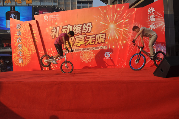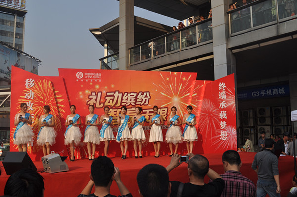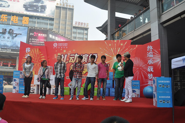 早上五点多,人员到位,开始调试设备,走场排练。10月1日国庆首日上午9点,中国移动通信集团终端有限公司河南分公司举办的“礼动缤纷•智享无限”大型路演活动正式拉开帷幕。音乐响起,主持人登场,整个二七广场的焦点瞬间凝聚到舞台上。帅气、时尚、动感十足的街舞表演;磁性嗓音、长相酷酷的四人电子击打乐队表演;惊险刺激、力量与智慧的小轮车特技表演,吸引了整个商圈的眼球,连二楼天台走道都围满了人。每次一上台都引起一片掌声、呼喊声。活动现场我们准备的投篮机前,排起了长长的队伍。手机同屏互动游戏吸引了更多的年轻时尚一族围观。各参加厂家的展位前,拥挤着咨询和参观的人群。