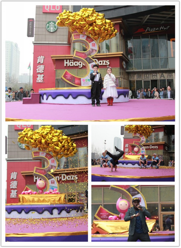 2013年3月16日,在郑州国贸360广场举办了主题为“潮伴三周年”的大型生日派对,满是奶油的紫色大生日蛋糕舞台、舞台上耸立的“3”字上挂满了心形氢气球,引来许多潮客们放慢步伐拿起手机拍照,蛋糕控们可是一饱巨型蛋糕的眼福了,更有一些小朋友激动的指着氢气球不肯离开,活动还未开始就已经人山人海。