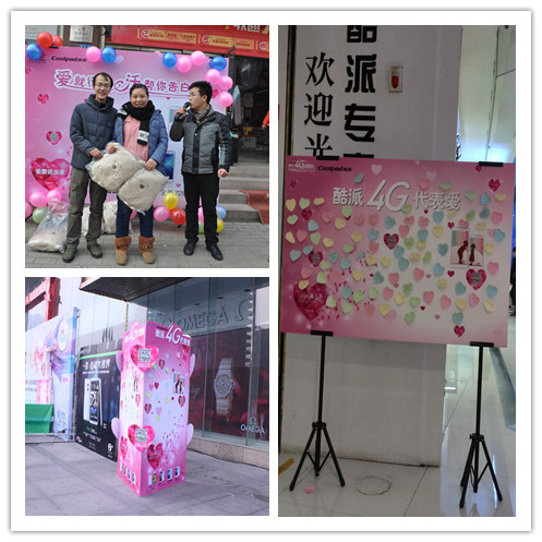 2 月 14 日,是代表浓浓亲情的传统元宵节与代表浪漫爱情的西方情人节邂逅的特殊日子。当天,中鑫传媒成功为酷派手机策划的“酷派4G代表爱”的心愿展板吸引了过往顾客观注。一张张小小的心形便签纸载满大家对爱人、父母、朋友的祝福和马年大家心中的美好愿望。