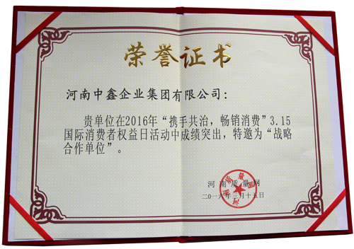 在本次活动中河南中鑫企业集团有限公司在2016“携手共治,畅销消费”3.15国际消费者权益日活动中成绩突出,特邀为“战略合作单位”,并在众多颇具竞争力的企业中脱颖而出,荣获“河南省重质量、守信誉战略合作单位”荣誉称号!