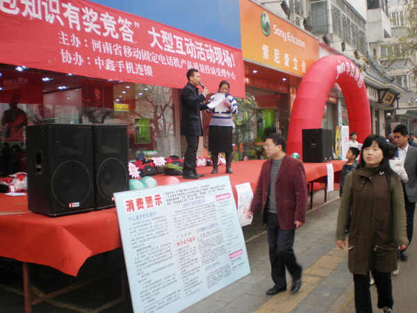 河南移动电话产品质量投诉中心相关负责人,商报记者也亲临活动现场,大大增强了我们当天活动的权威性.为了这次活动,市场部人员进行了精心的策划和准备,舞台、音响、主持人,还有诺基亚手机、精致的旅行包和福娃手机饰品等奖品一应俱全,这都极大的吸引了顾客的注意力。一些忠实的顾客一直守在活动现场,等待赢得诺基亚的手机,究竟“机”落谁家?随着主持人竟答活动的有序进行播报赢手机的诱惑,现场充满了期待。