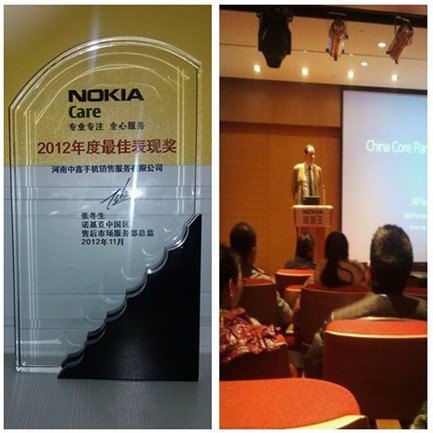 11月15日至16日,诺基亚公司组织了一场售后服务核心伙伴会议由店面运营总监李梅霞及店面经理王慧代表中鑫手机参加了此次会议。最值得骄傲的是,通过中鑫人的不懈努力,我们拿到了诺基亚售后2012年度最佳表现奖!