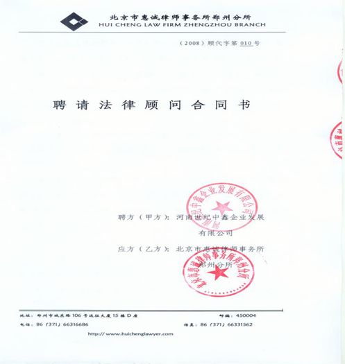2008年5月19日,集团与北京市惠诚律师事务所正式签订了《聘请法律顾问合同书》。旨在强化法制意识,促进公司各项工作依法进行。