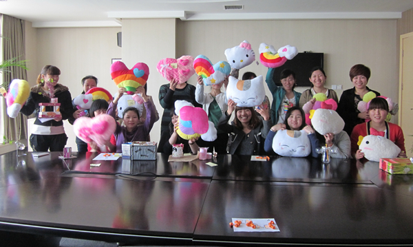 本次参赛人员为通信商务部全体人员,每位同事捧着自己在清明小长假精心准备的DIY作品欢呼簇拥着进入会场,附上简单的作品介绍在多功能桌上依次展开,被众多作品围绕在中心的是领导特意给这次活动准备的奖品:五彩缤纷的可爱抱枕。