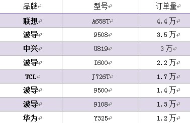 中鑫通信的订单中,按品牌分类,波导品牌以 11.4万台的订货量稳居榜首,夺得冠军宝座,联想品牌5.2万台居亚军,中兴品牌4.4万台居季军。