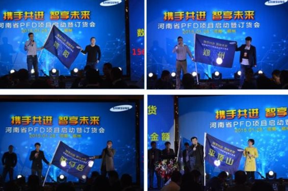 15:00,会议正式开始,三星电子华中大区手机TEAM长金星宸、河南中鑫企业集团有限公司副总裁、河南中鑫通信有限公司总经理陈剑分别发表了精彩致辞,而后,三星电子华中大区FD渠道总监胡永强对三星PFD项目进行了详细阐述,明确了三星PFD模式的最大优势,就是通过DMS系统把零售商,省FD,厂家联系在一体,利用DMS系统达到流通可视化,使零售客户准确的掌握自己门店的为进销存,实现精准预测,减少因库存和预测不准带来的销售损失。同时,通过DMS系统快速实现信息流,资金流,物流的可视化,实现渠道和零售客户利润最大化。另外,三星也提供了丰富的产品资源、标准化的硬件形象、驻店促销员等相当大的市场支撑。