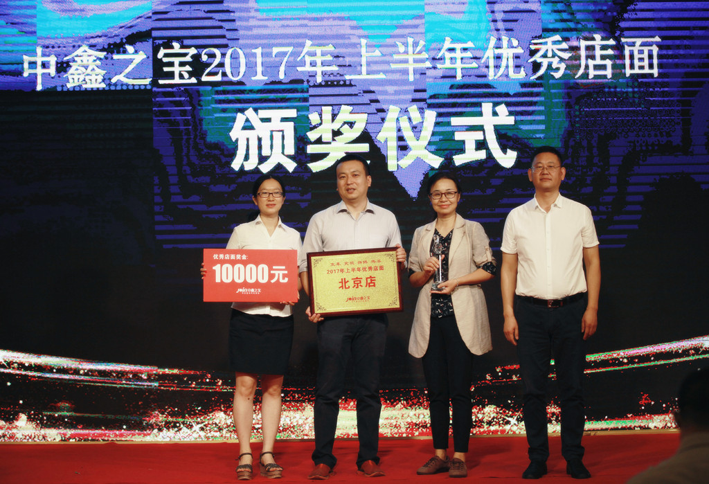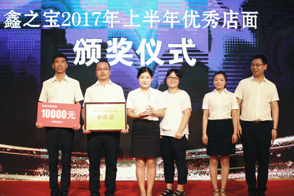 会议首先进行的是2017年上半年优秀店面颁奖仪式。中鑫之宝圃田店,厦门店,北京店,中原店,天中店,新密店六个店面上半年在业务探索与发展,有效管理的实施及业绩提升方面成绩优秀,从全国店面中脱颖而出,荣获2017年上半年优秀店面奖。