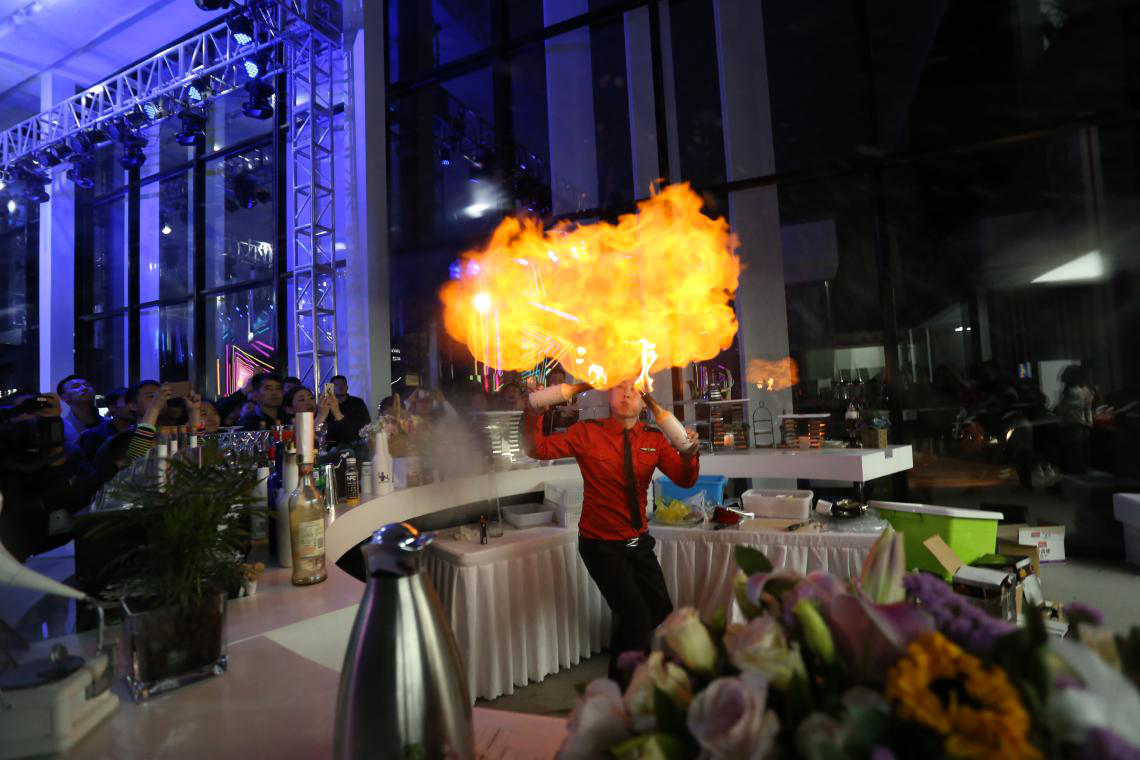 嗨爆全场的MC、热辣的舞蹈,特技焰火调酒表演等现场欢呼声不断。