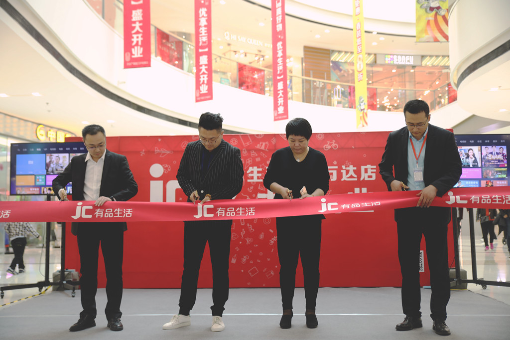 随着青春靓丽的主持人宣布:“JC有品惠济万达店开业典礼正式开始。”缤纷的礼花在空中绽放开来。惠济万达总经理党玉玲、中鑫新零售分公司副总宋来寿、河南有品电子科技有限公司首席设计师琚昊原、JC有品惠济万达店长薛雷,一起为JC有品盛情剪彩。